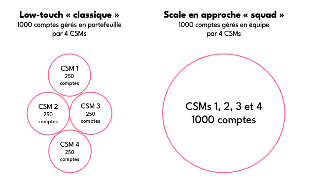 Cette approche en squad donne la responsabilité d’un plus large volume de clients non pas à une personne attitrée, mais à une équipe, composée en général de3 à 5 CSM. Cette approche permet plus de flexibilité puisqu’il y a moins de dépendance, et un meilleur scale puisque l’équipe va réfléchir à l’échelle d’un book beaucoup plus large.